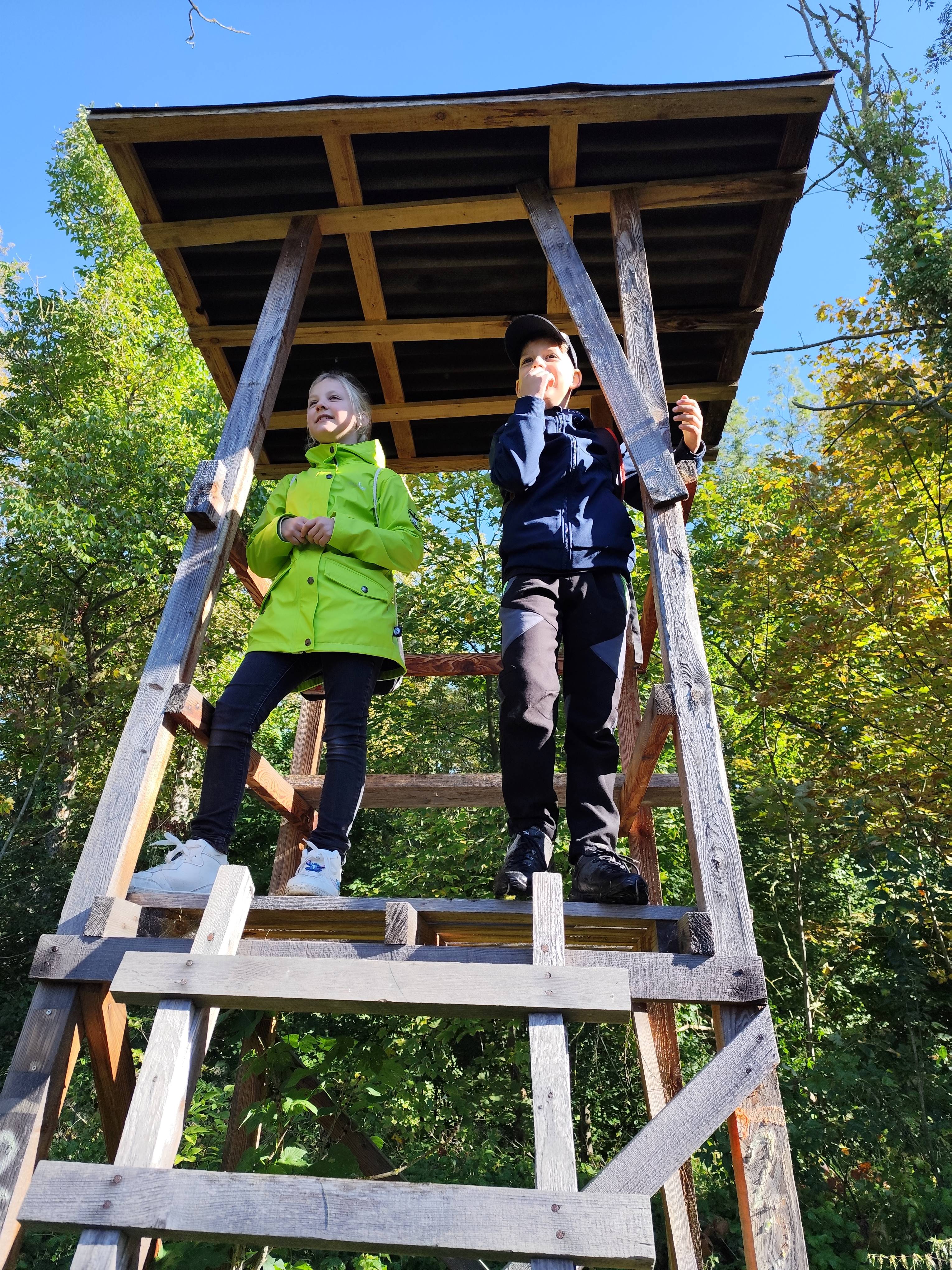 Gleich zu Beginn lernten die Kinder die verschiedenen Stockwerke des Waldes kennen – vom Boden bis hinauf in die Baumkronen. Besonders aufregend wurde es, als die jungen Naturforscher selbst auf „Jagd“ gingen: In den Büschen waren Tieraufsteller versteckt, die entdeckt und benannt werden mussten. Ein Highlight dabei war das Klettern auf einen Hochsitz, um den Überblick über das Wild zu behalten.